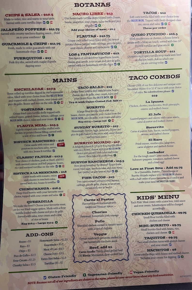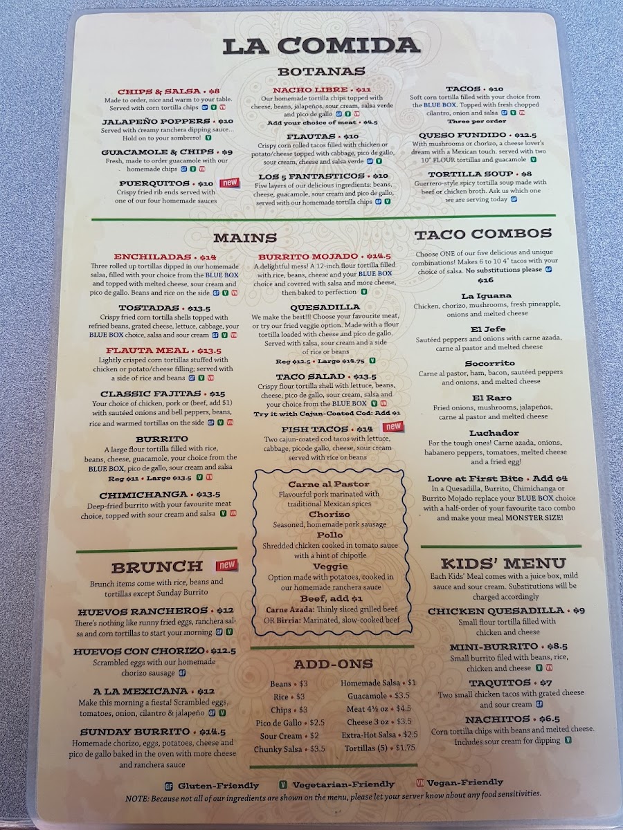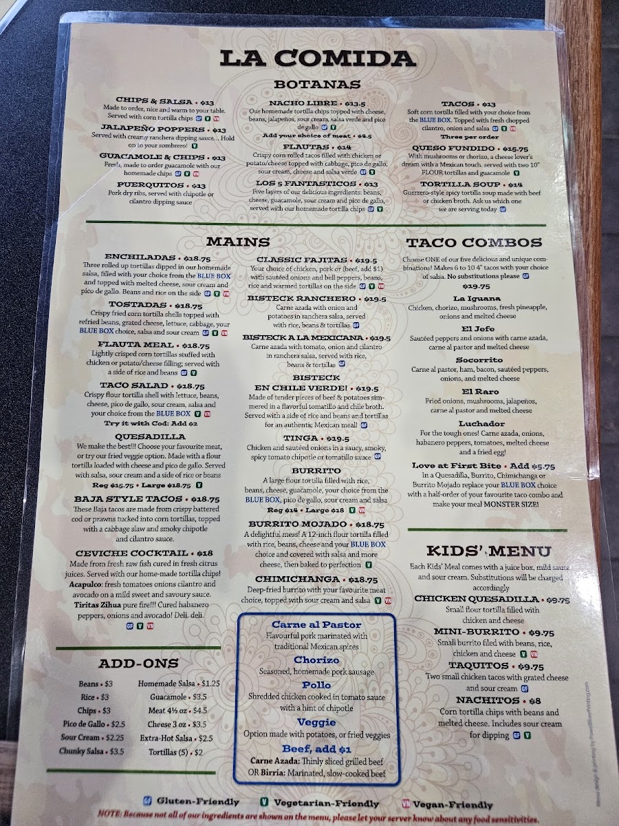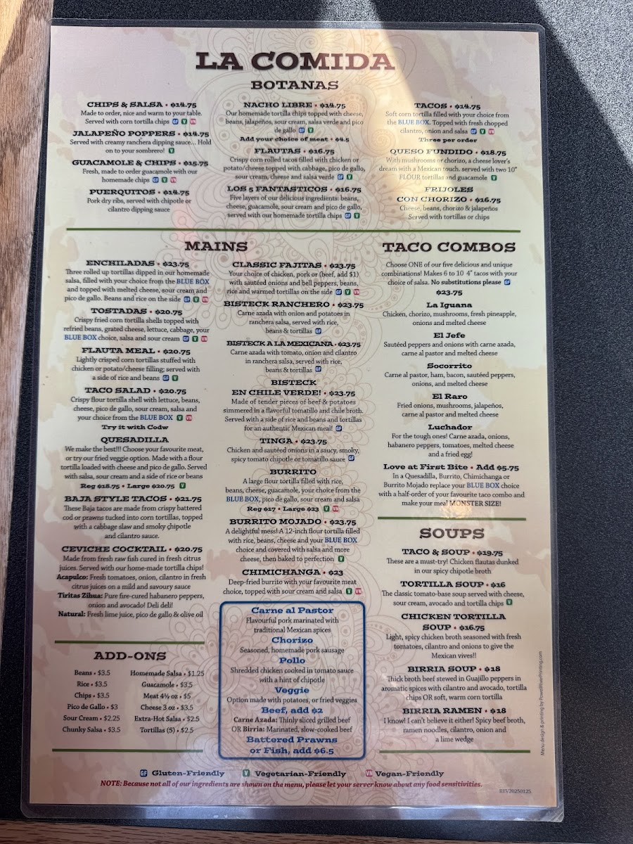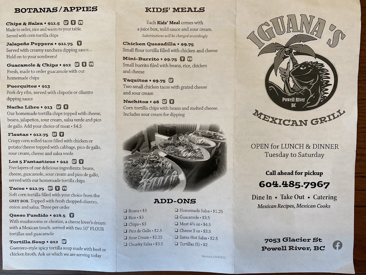 The menu at Iguanas Mexican Grill offers a delightful array of dishes that showcase the vibrant flavors of Mexican cuisine. For a flavorful start, the Botanas section presents options like Flautas, Los 5 Fantasticos, and Tacos Queso Fundido, which are perfect for sharing or enjoying as appetizers. The Mains are equally appealing, with hearty choices such as the classic Enchiladas, crispy Tostadas, and satisfying Flauta Meal. The Taco Salad and Quesadilla are also popular, offering light yet filling options. Soup lovers can indulge in comforting bowls like Taco & Soup, Tortilla Soup, or the rich Chicken Tortilla Soup. For something unique, the Birria Soup and Birria Ramen are standout choices. Kids can enjoy simpler fare with meals like the Chicken Quesadilla, Mini-Burrito, and Taquitos, while there are also Nachitos for snacking. The restaurant also offers a variety of Add-Ons like Beans, Rice, Chips, Pico De Gallo, and Sour Cream to complement any dish. If you're in the mood for something extra, the Chips & Salsa, Jalapeño Poppers, and Guacamole & Chips are great additions, while Puerquitos and the signature La Iguana provide unique finishing touches to your meal. Whether you're craving a savory appetizer, a filling main dish, or a flavorful soup, Iguanas Mexican Grill offers something to satisfy every taste.